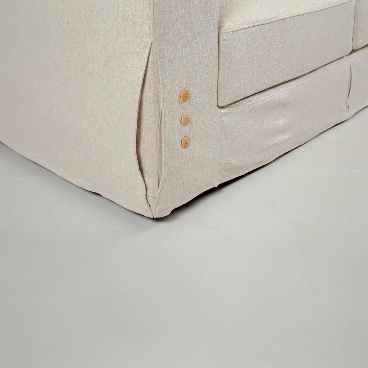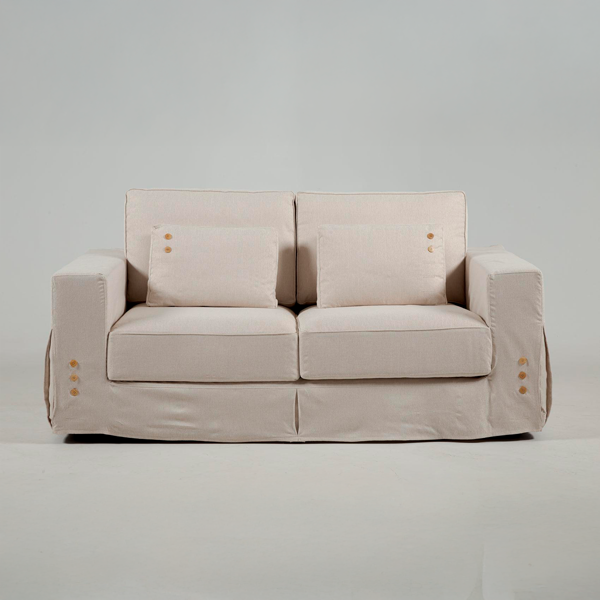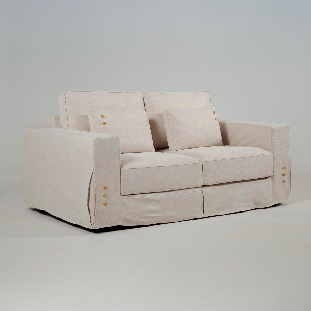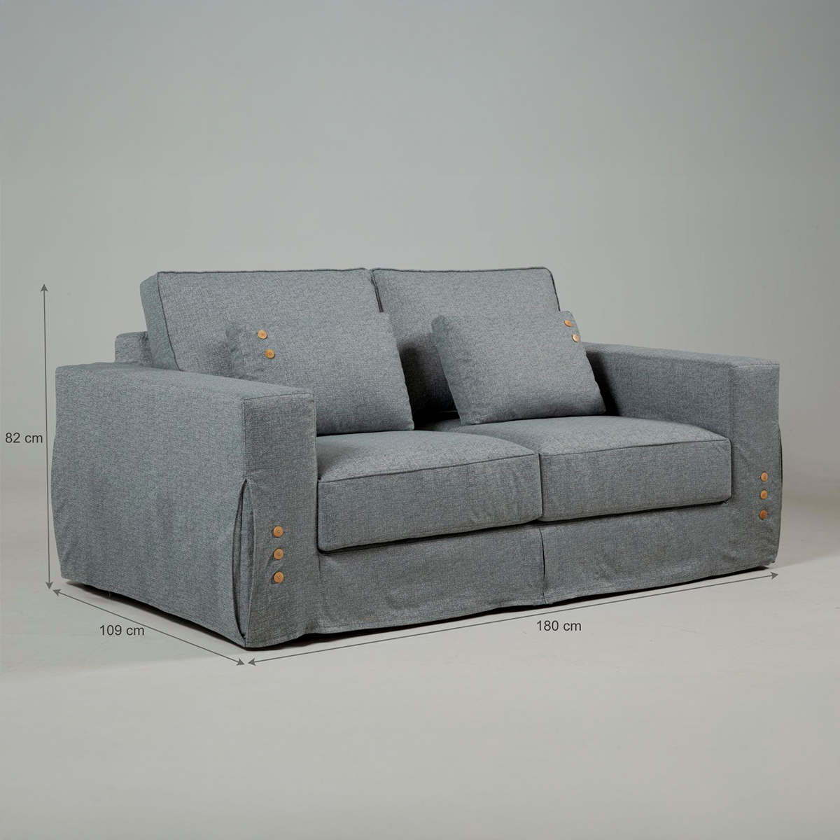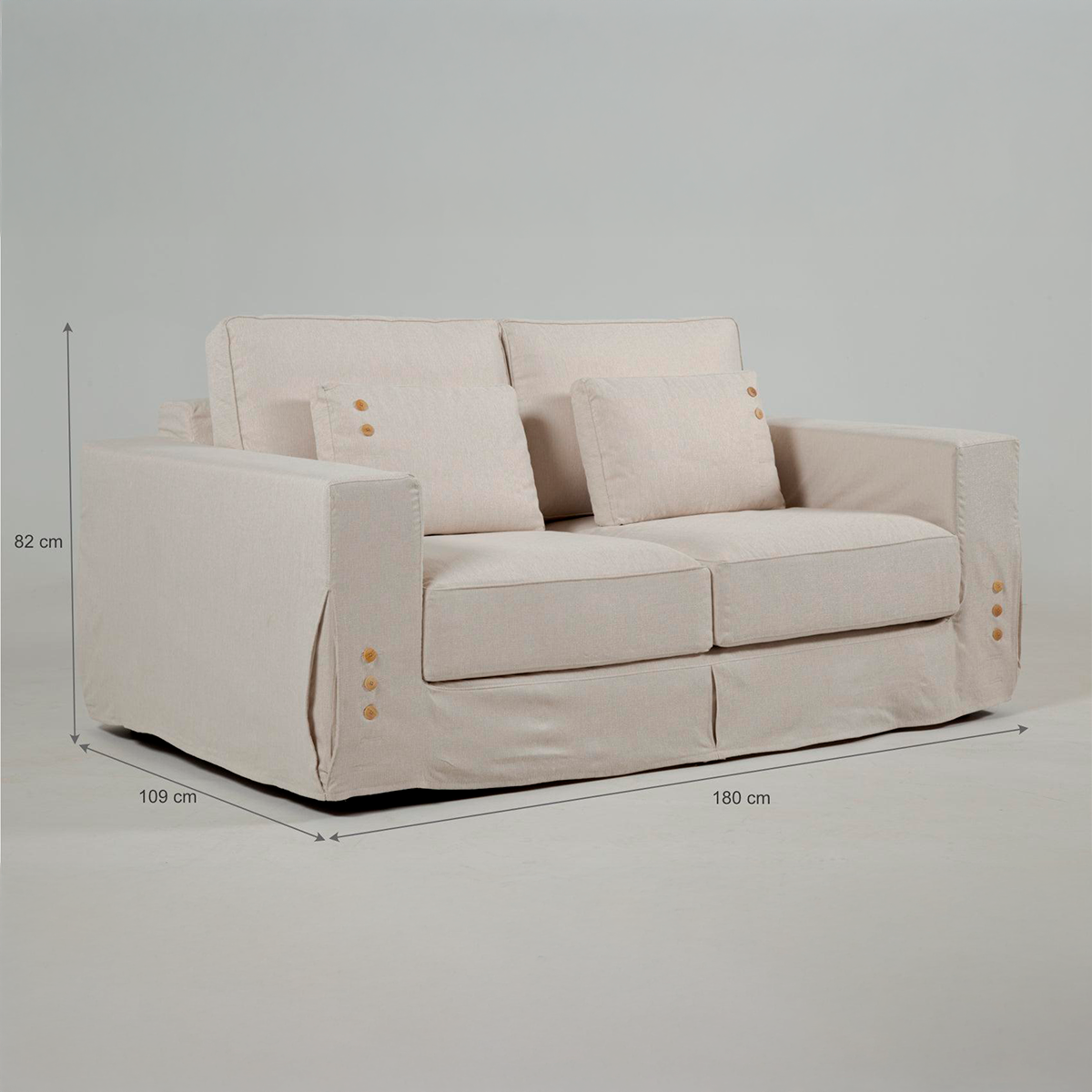 Ein Sofa, das Komfort und Zeitlosigkeit verströmt! Schon seine schlichte Anwesenheit im Wohnzimmer sorgt für ein Gefühl der Gemütlichkeit. Außerdem ist sein größter Vorteil seine Praktikabilität! Das Sofa ist vollständig von einem Bezug bedeckt, der bei Bedarf leicht abgenommen und gewaschen werden kann. Die Zugabe von zwei kleineren Kissen bringt noch mehr Komfort und einen Charme in der Ästhetik.